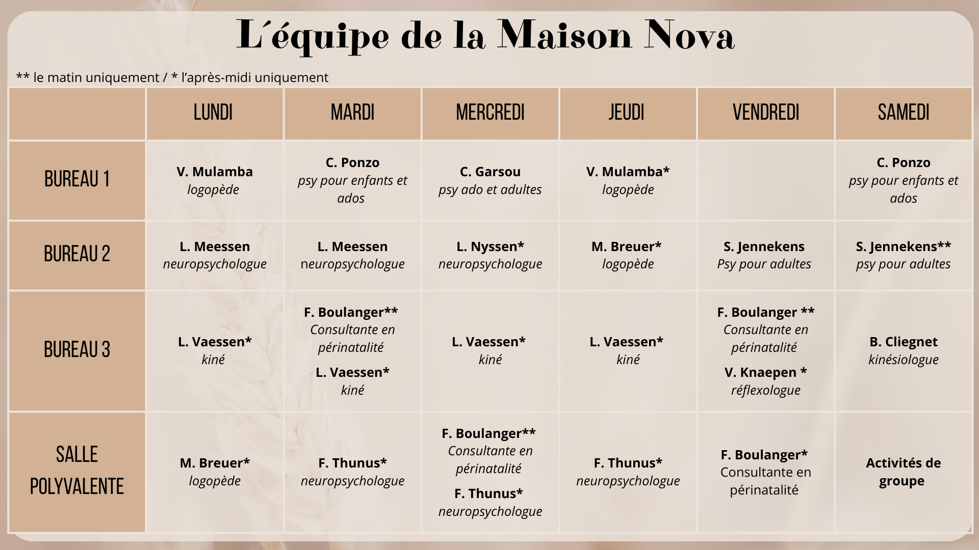 La Maison Nova, située à Welkenraedt, offre des services en logopédie, psychologie, kinésithérapie, neuropsychologie et d'autres spécialités. Nous sommes dévoués à offrir des soins de qualité à nos patients dans un environnement chaleureux et professionnel.